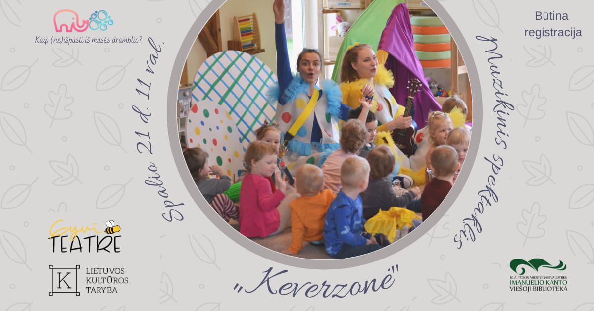 Spalio 21 d., penktadienį, 11 val. kviečiame tėvelius kartu su vaikais (1,5–4 m.) į muzikinio teatro visai šeimai „GYVI TEATRE“ interaktyvų muzikinį spektaklį „Keverzonė“ Klaipėdos miesto savivaldybės Imanuelio Kanto viešosios bibliotekos Vaikų padalinyje (Danės g. 7).
