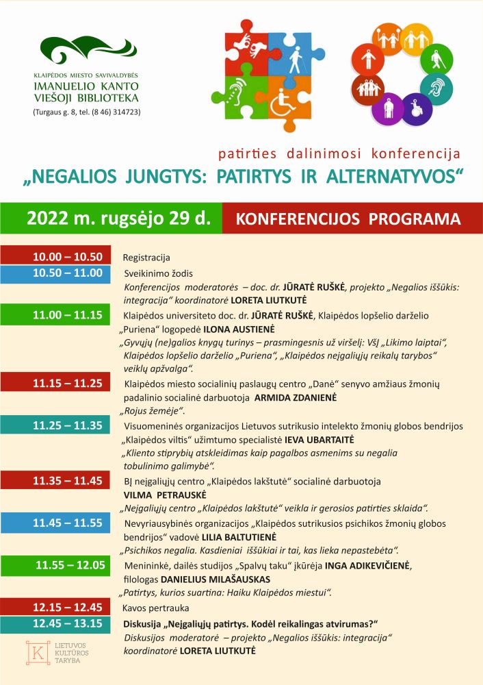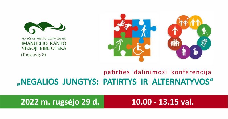 Rugsėjo 29 d., ketvirtadienį, 10.00–13.15 val., Klaipėdos miesto savivaldybės Imanuelio Kanto viešojoje bibliotekoje (Turgaus g. 8) vyks patirties dalinimosi konferencija „Negalios jungtys: patirtys ir alternatyvos“.