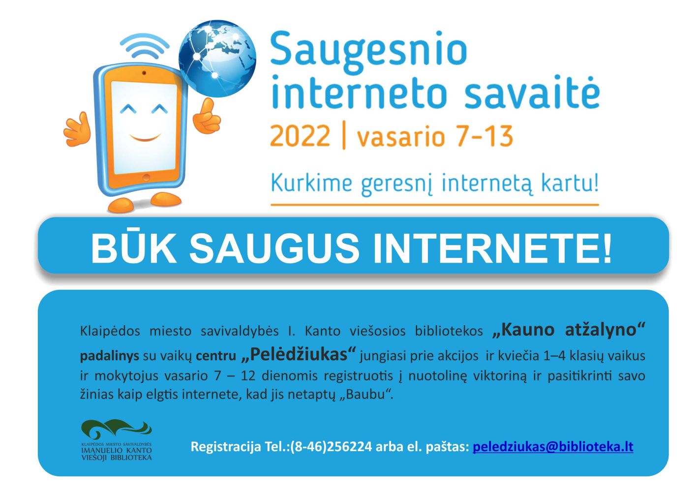 Klaipėdos miesto savivaldybės I. Kanto viešosios bibliotekos „Kauno atžalyno“ su vaikų centru „Pelėdžiukas“ padalinys jungiasi prie akcijos „Saugesnio interneto savaitė“ ir kviečia 1-4 klasių vaikus ir mokytojus vasario 7–12 dienomis registruotis į nuotolinę viktoriną ir pasitikrinti savo žinias kaip elgtis internete, kad jis netaptų „Baubu“.