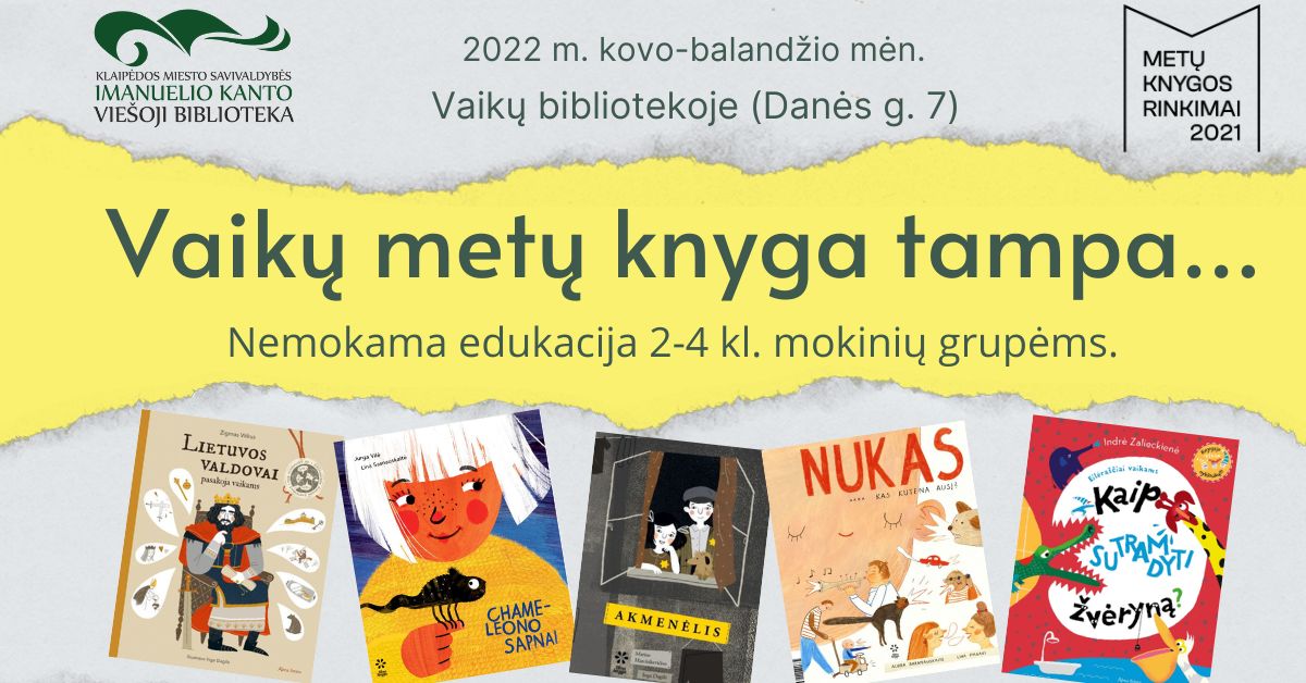 Kovo – balandžio mėnesį Klaipėdos miesto savivaldybės Imanuelio Kanto viešosios bibliotekos Vaikų padalinyje (Danės g. 7) kviečiame 2-3 kl. klasių mokinių grupes į nemokamą edukaciją „Vaikų metų knyga tampa...“. Programa skirta pristatyti konkurso „Metų knygos rinkimai 2021“ Vaikų knygas nominantes.