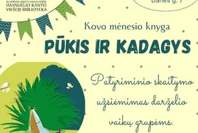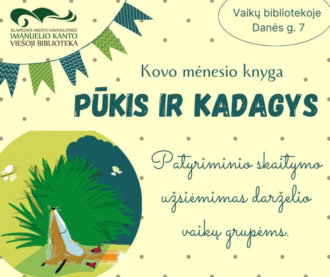 • Patyriminiai skaitymo užsiėmimai darželio vaikų grupėms. Kiekvieną mėnesį skaitysime, išgirsime, liesime, užuosime, o gal ir „ragausime“ naujausias bibliotekos knygas. Kovo mėn. knyga – „Pūkis ir kadagys“ Vytautas V. Landsbergis.